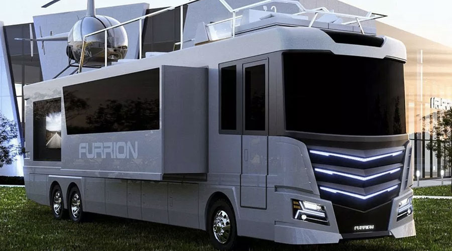 Furrior Elysium: esta es la autocaravana de ensueños de muchas personas ya que cuenta con comodidades únicas como una habitación para dos personas accesional, un baño de lujo, pantallas planas,  una cocina esplendida pero lo mejor de todo es que la parte superior de la autocaravana fusiona como terraza con una gran salón, jacuzzi y lo más impresionante de todo con su propio helicóptero personal.